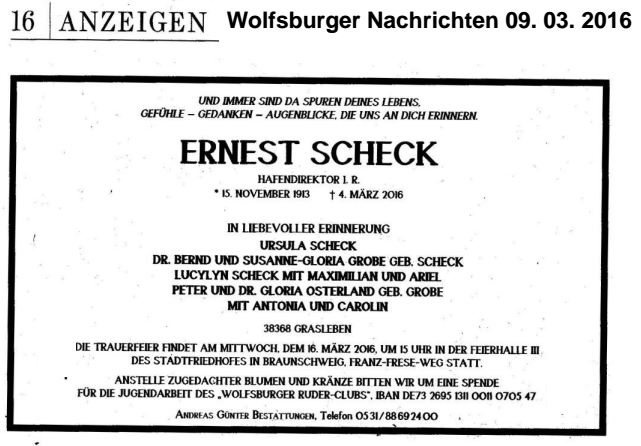 Oben die Anzeige der Familie Scheck in der Wolfsburger Nachrichten. Auch hier wurde, wie wir unseren Ehemaligen kennen, an den WRC gedacht.